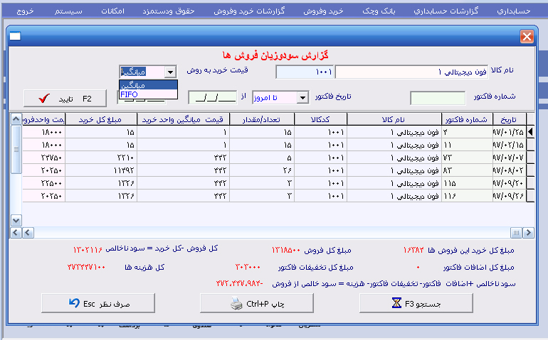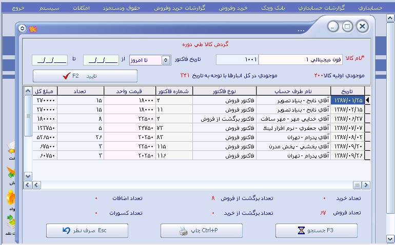 عملیات خاص : ( تعریف چند انبار ، لیست سفارشات کالا ، سود و زیان در بازه تاریخی مشخص ) |