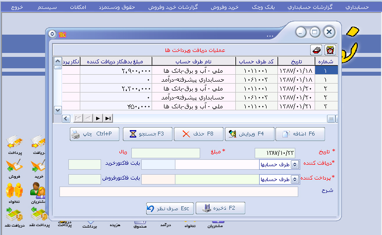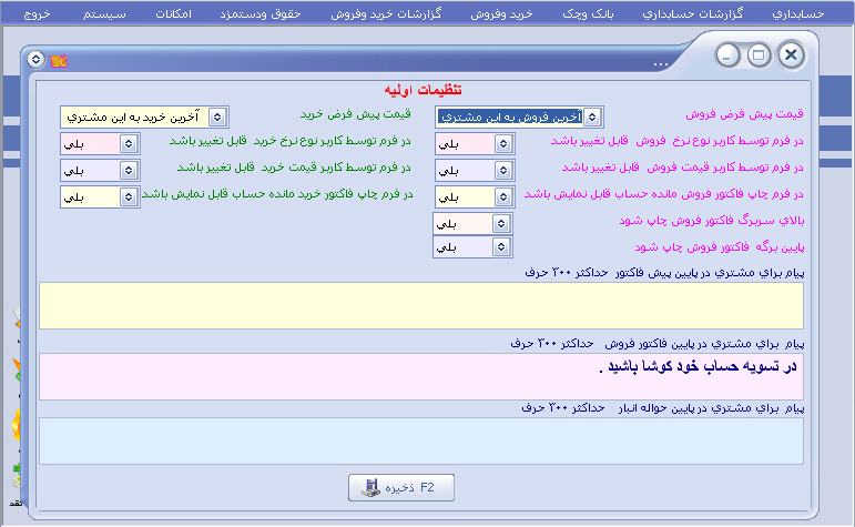 امکانات : ( دفترچه تلفن ، بزرگنمایی صفحه اصلی ، باز شدن تمامی فرم ها با هم ، خروجی گزارشات به فرمت اکسل ، یادآوری چک ها و یادداشت ها ، پشتیبانی اتومات ) |