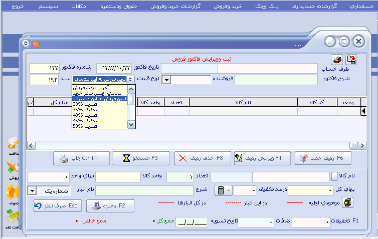مکمل انبار : ( فاکتور خدمات کارفرما و پیمانکار ، کار با دستگاه بارکد ، ویزیتور و بازاریاب ، تخفیف ردیفی در فاکتور ، ثبت تسویه در فاکتور ، ثبت اسناد دریافتی برای هر فاکتور)